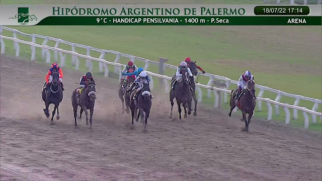 Corrida al milímetro por Martín Valle, Sevilla Halo siguió desde el tercer puesto la pulseada entre Donna Gaia y Embrigame, la dos yeguas más cotizadas y las que se disputaron la vanguardia, para aguardar la recta para entrar en acción.
